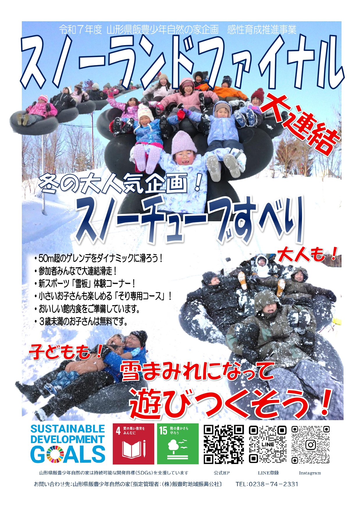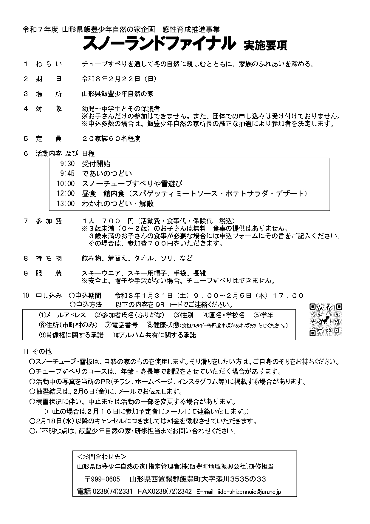 【開催日時】令和8年2月22日 【場所】山形県飯豊少年自然の家 【連絡先】0238-74-2331 【申込締切】1月31日(土)9:00~2月5日(木)17:00