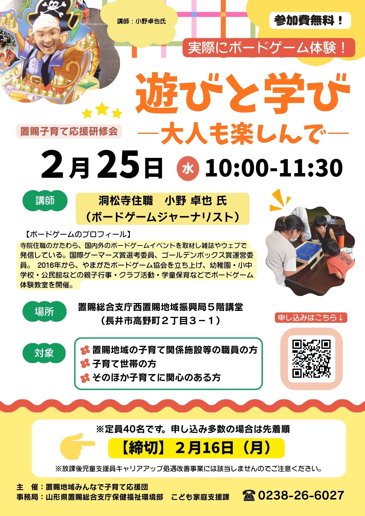 寺院住職のかたわらボードゲームジャーナリストとして御活躍の小野卓也氏を講師にお迎えし、置賜の子育てを応援する研修会を開催します!